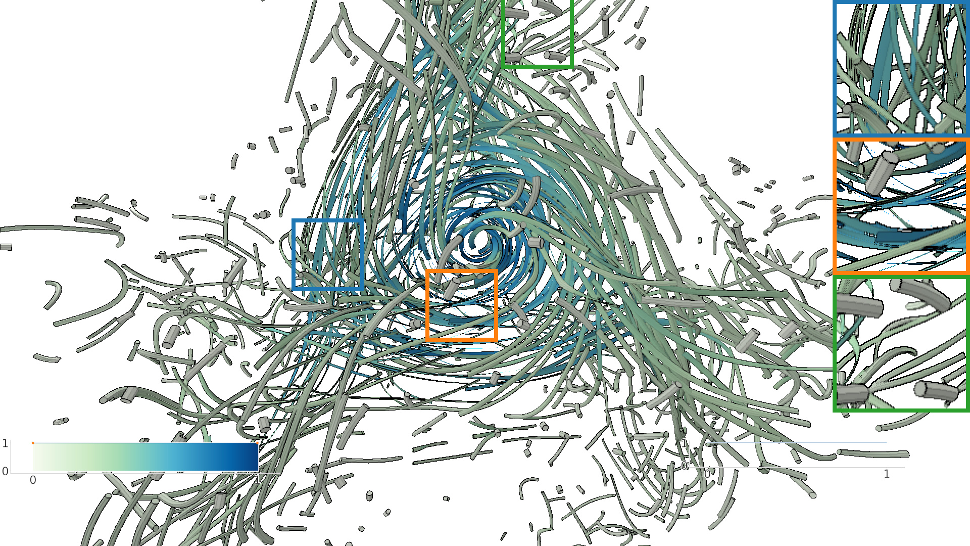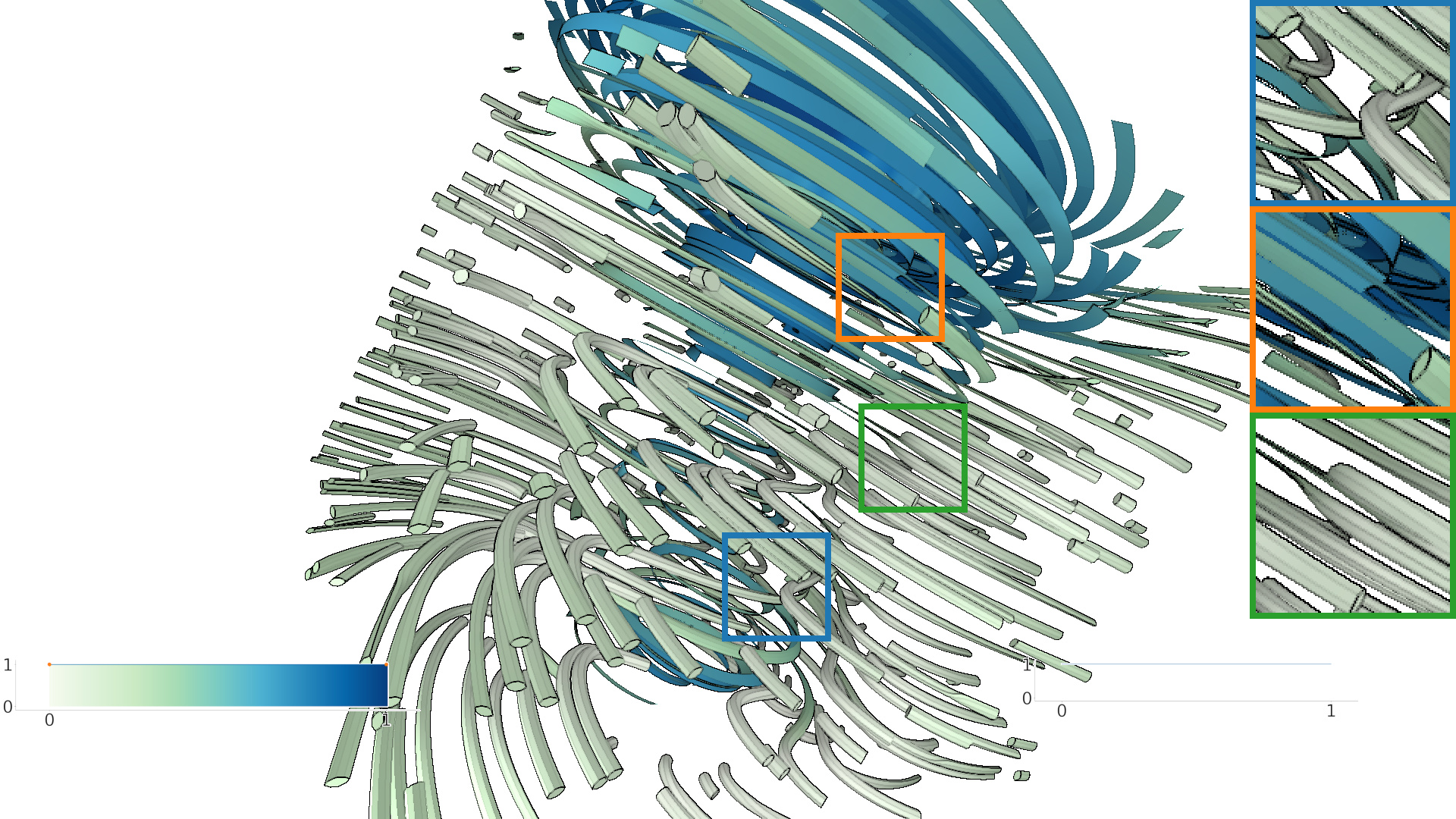 Encoding vector field attributes using different cross-section glyphs and interpolation instants. High magnitude velocities are marked with streamribbons and low values are marked with interpolation instants between a disk shape and a streamribbon.